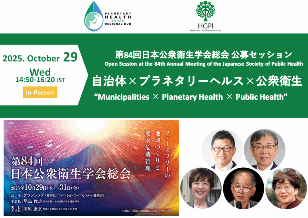 日本医療政策機構(HGPI: Health and Global Policy Institute)とプラネタリーヘルスアライアンス日本ハブ(Planetary Health Alliance Japan HUB)の共催により、「自治体×プラネタリーヘルス×公衆衛生」をテーマとしたグループワークセッションを、2025年10月29日(水)の第84回日本公衆衛生学会総会において開催します。(HGPI セッション概要サイト)